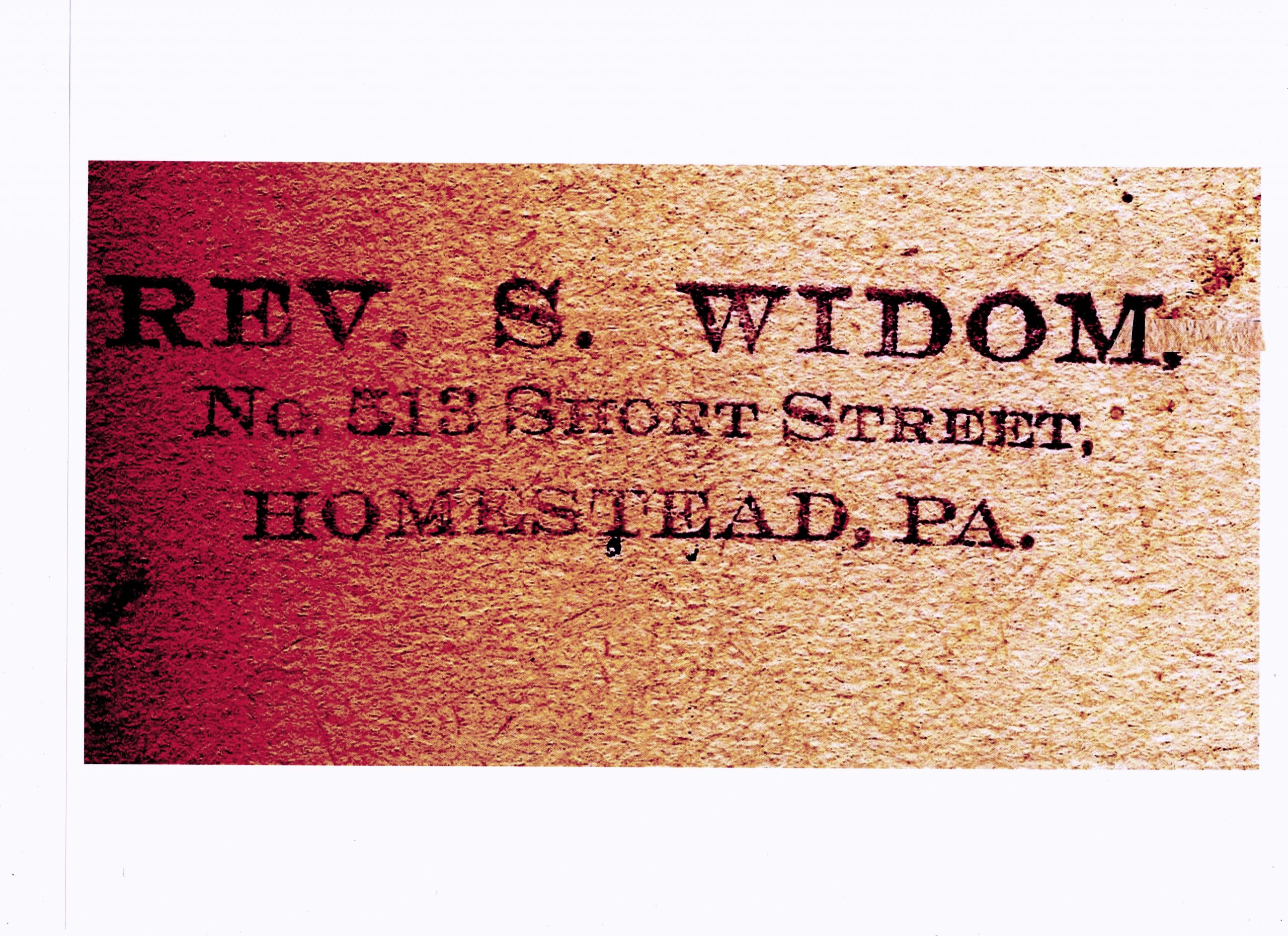 | Text of Stamp: | Rev. S. Widom No. 513 Short Street Homestead, PA |